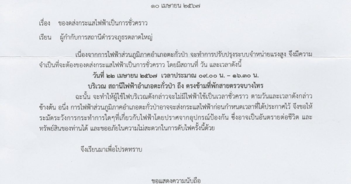 วันที่ ๒๒ เมษายนน 2567 เวลาประมาณ ๐๙.๐๐ น. – ๑๖.๓๐ น. การไฟฟ้าตะกั่วป่า งดส่งกระแสไฟเป้นการชั่วคราว บริเวณสถานีไฟฟ้าตะกั่วป่า ถึงตรงข้ามที่พักสายตรวจตำบลบางไทร