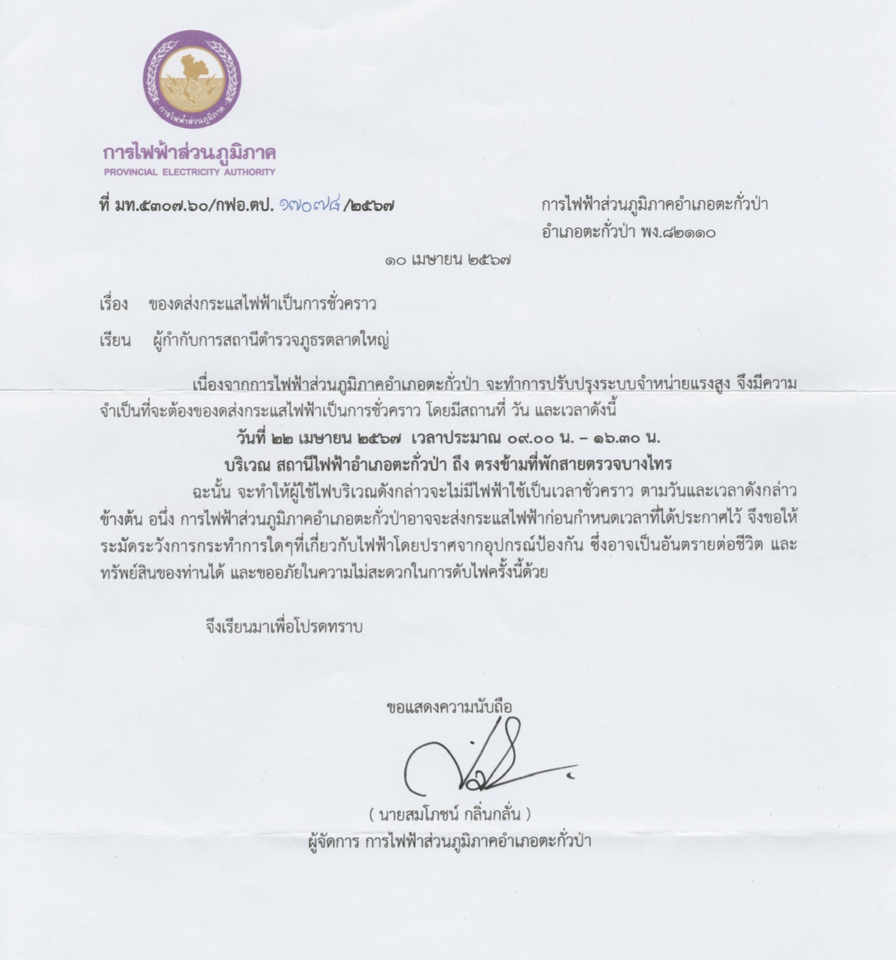 วันที่ ๒๒ เมษายนน 2567 เวลาประมาณ ๐๙.๐๐ น. – ๑๖.๓๐ น. การไฟฟ้าตะกั่วป่า งดส่งกระแสไฟเป้นการชั่