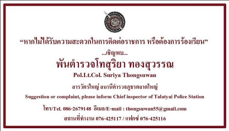 สถานีตำรวจภูธรตลาดใหญ่ 2 ถ.ราษฎร์บำรุง ต.ตะกั่วป่า จ.พังงา 82110