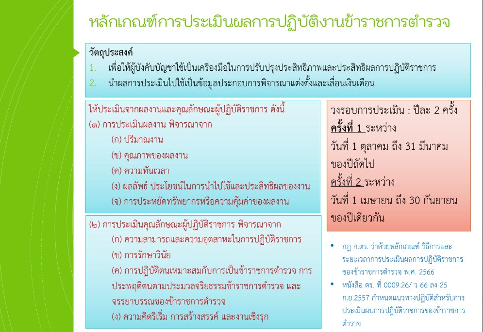 - กฎ ก.ตร. ว่าด้วยหลักเกณฑ์ วิธีการและระยะเวลาการประเมินผลการปฏิบัติราชการของข้าราชการตำรวจ พ.ศ.2566